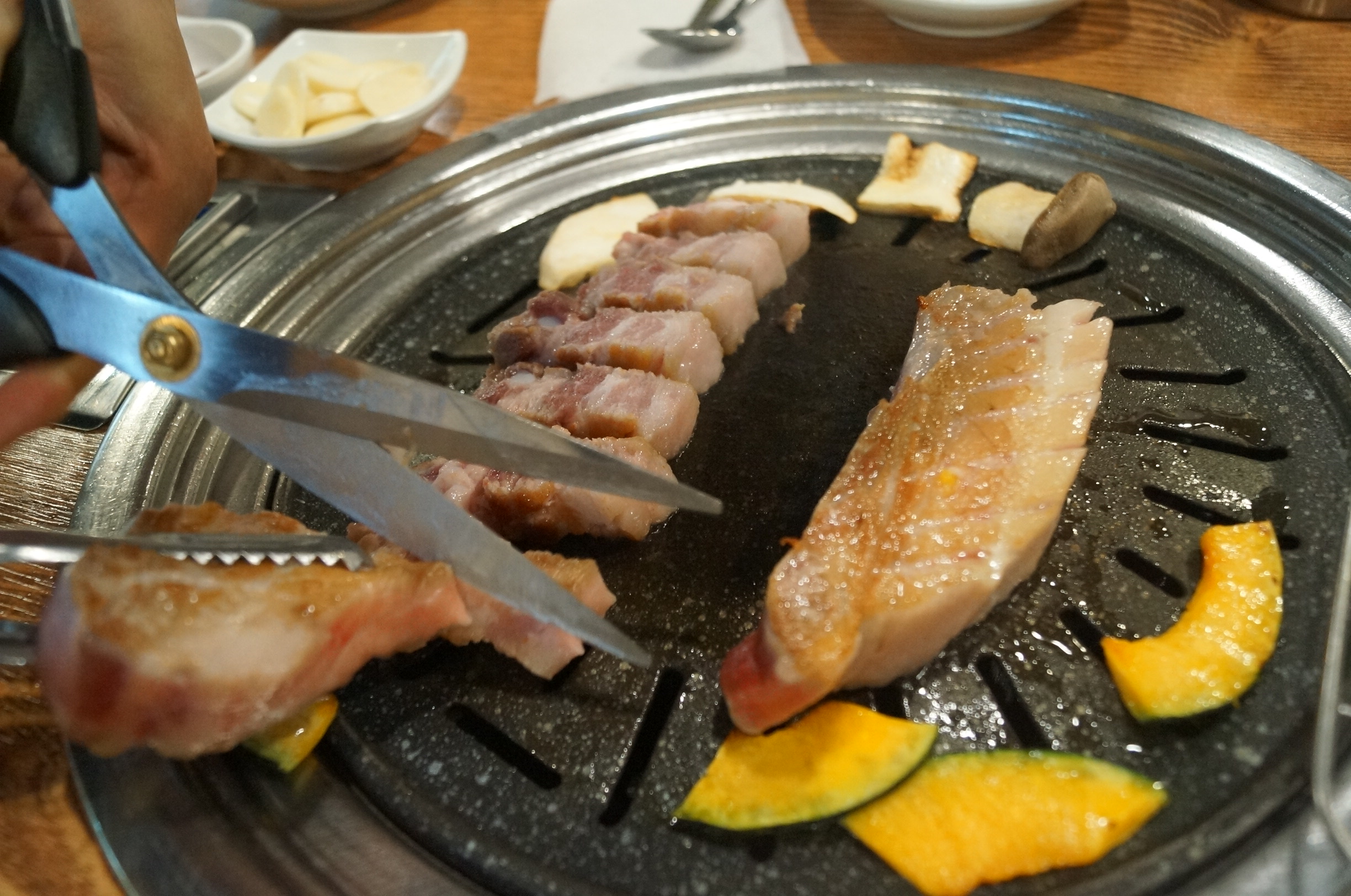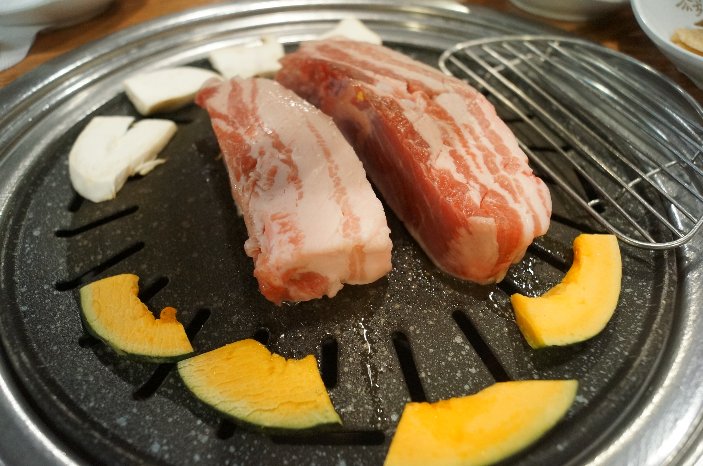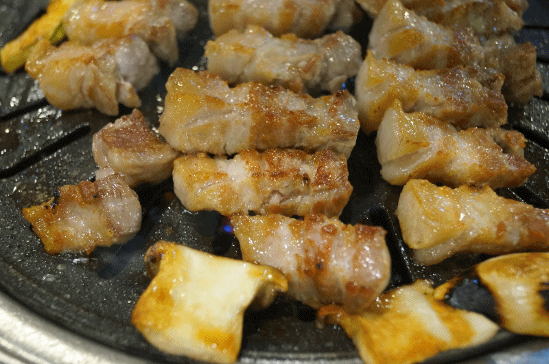 고기 굽기 좋은 온도가 되었을 때 삼겹살을 직접 올려주시고 직접 구워주신답니다!!