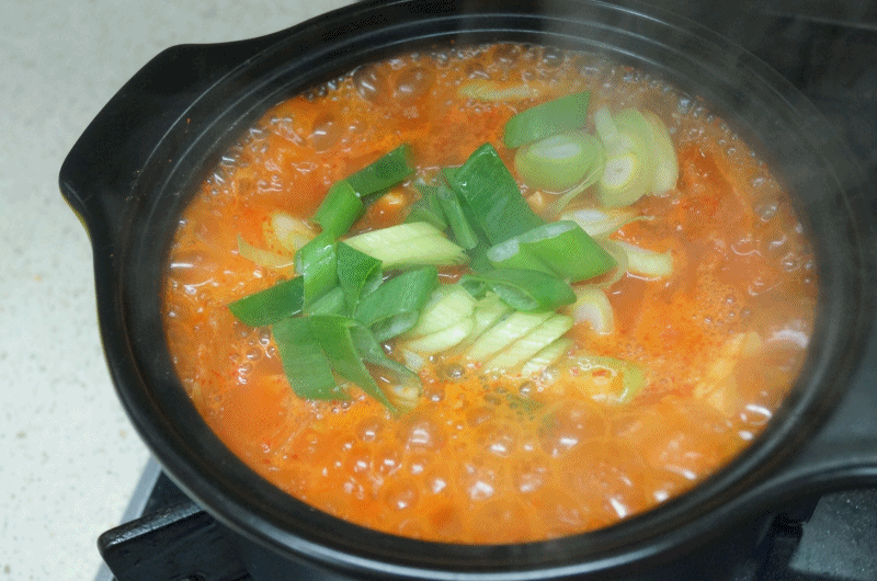 9. 마지막으로 파를 올려주시면 맛있는 스팸두부김치찌개가 완성된답니다!!!