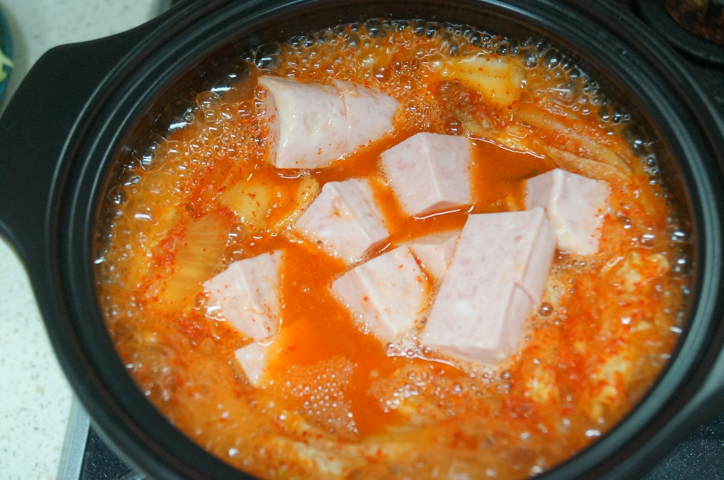 재료 : 김치, 스팸, 고추가루, 두부, 김치국물, 파 그리고 천연조미료 조금