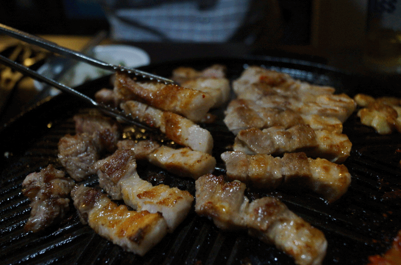 고기가 어느 정도 익어서 기름이 나오면 김치를 올려서 구우세요