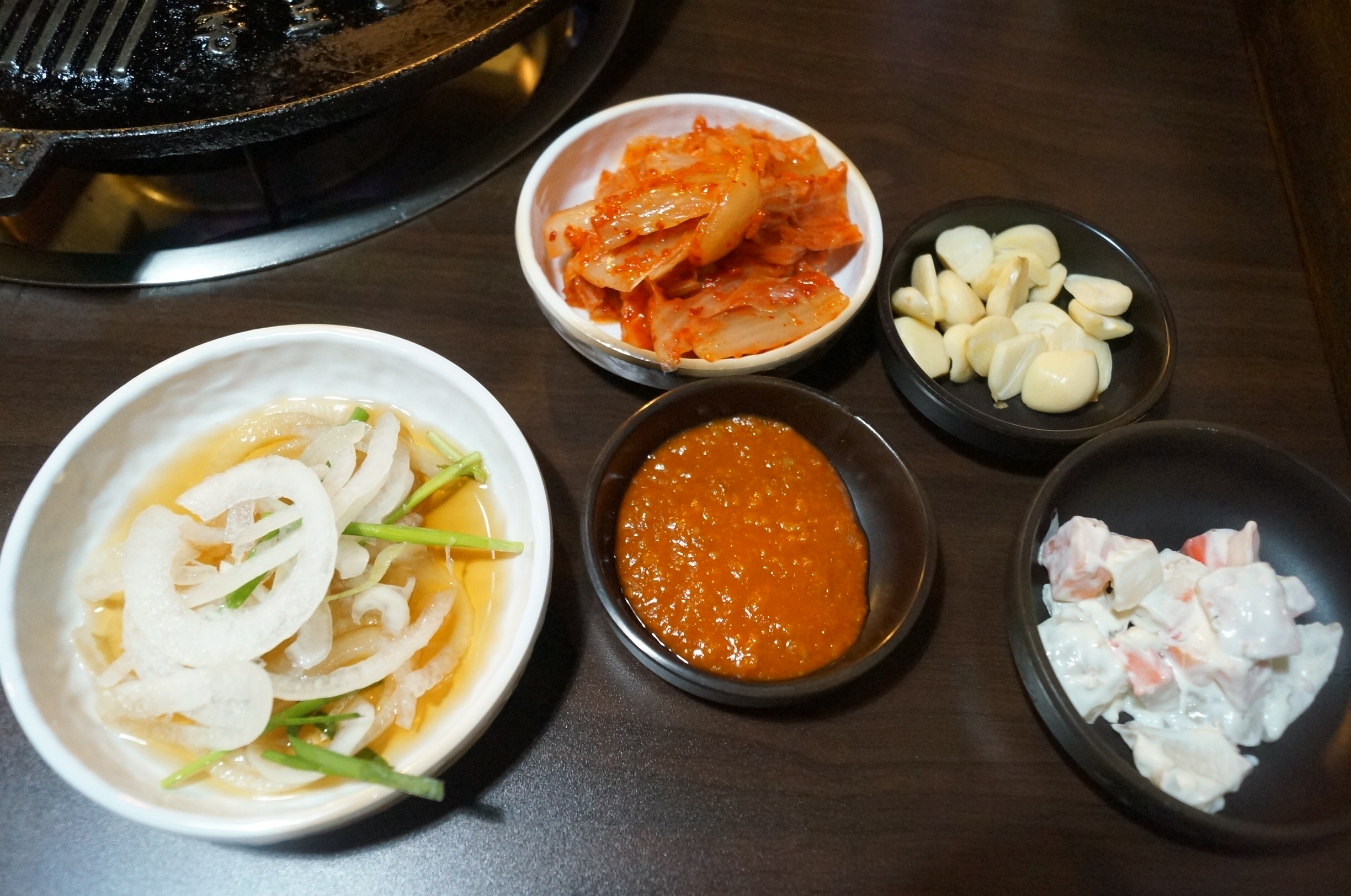 기본 세팅 반찬입니다. 반찬은 고기랑 먹기 딱 좋은 반찬들로만 구성되어 있어요!!